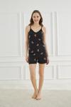 Siyah zemin üzerine yerleştirilen ayıcık ve kalp desenleri, takıma enerjik ve genç bir stil kazandırırken, dantel detaylı ip askılı üst parçası feminen bir dokunuş sunar.