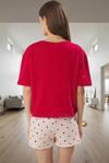 Pijama takımı, 30/1 openend süprem dokuma tekniğiyle üretilmiştir. Regular boy ve boru paça modeliyle rahat bir uyum sunar. Kırmızı renk ve kalpli desenli şort kombinasyonu ile tarzınıza tarz katın. Hem uyku zamanı hem de evde rahatlamak için idealdir. Makinede yıkama talimatlarına uyarak, uzun süre boyunca ilk günkü gibi kullanabilirsiniz.