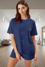 Rahatlığı ve şıklığı bir arada arayan kadınlar için ideal olan bu lacivert pijama takımı, gün boyu sürecek konfor sunuyor. Yumuşak pamuklu kumaşıyla teninize nazikçe dokunurken, kalpli desenleriyle de tarzınızı yansıtıyor. Eşsiz tasarımıyla evinizde veya dinlenmek istediğiniz her ortamda kendinizi özel hissetmenizi sağlayacak. Kısa kollu tişörtü ve boru paça şortu ile yaz aylarının vazgeçilmez parçası olacak bu takım, hem uyku zamanlarınızda hem de evde rahatlamak istediğiniz anlarda mükemmel bir seçim. Yüksek kaliteli malzemesiyle uzun yıllar boyunca kullanım sağlayacak olan bu pijama takımı, pratik yıkama talimatlarıyla da hayatınızı kolaylaştırıyor. Siz de bu konforlu ve şık pijama takımı ile kendinizi ödüllendirin!
