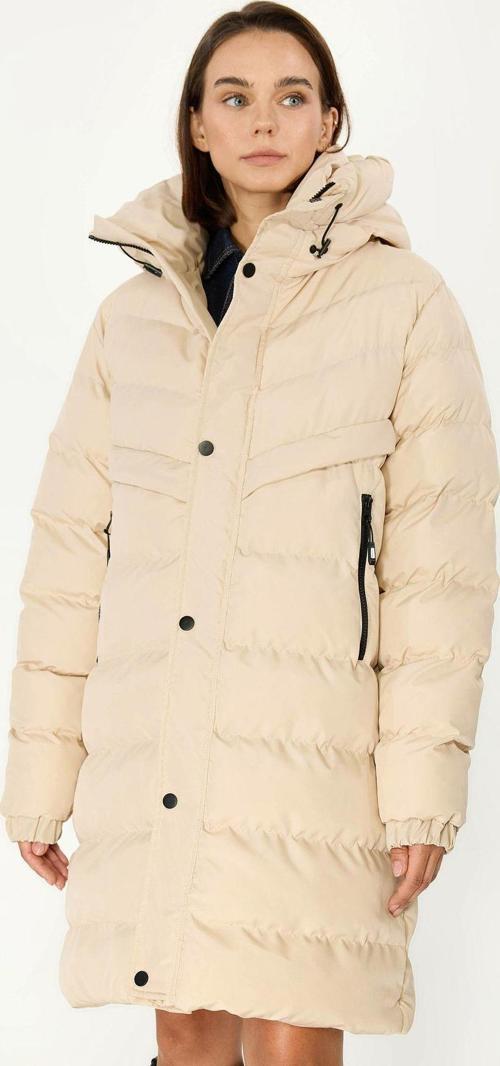 Qawwa Kadın Kapüşonlu Rüzgar Geçirmez Bej Şişme Uzun Kışlık Mont Parka Kaban