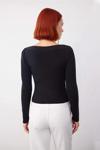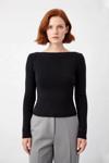 Ürün Özellikleri: Fitted kalıp, viskoz polyester poliamid materyal, düz desen, kayık yaka, standart kol, triko kumaş, siyah renk.