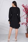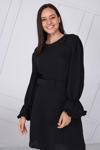 Bu elbise, zarif ve şık görünümünü volan kollu tasarımıyla modernleştiriyor. Günlük ve şık etkinliklerde tercih edilebilir, kemer detayı ise belinizi zarifçe vurgular.