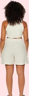 Pamuklu polyester karışımı kumaşıyla gün boyu konfor sağlar. Keten görünümlü dokuma yapısı, şık ve modern bir görünüm sunar. Çizgili deseniyle benzersiz bir stile sahiptir. Kısa boyu ve geniş paçası, yaz aylarına uygun bir rahatlık seviyesi sunar. Kemersiz tasarımı, pratik bir kullanım sağlar. Casual günlük kombinleriniz için idealdir.