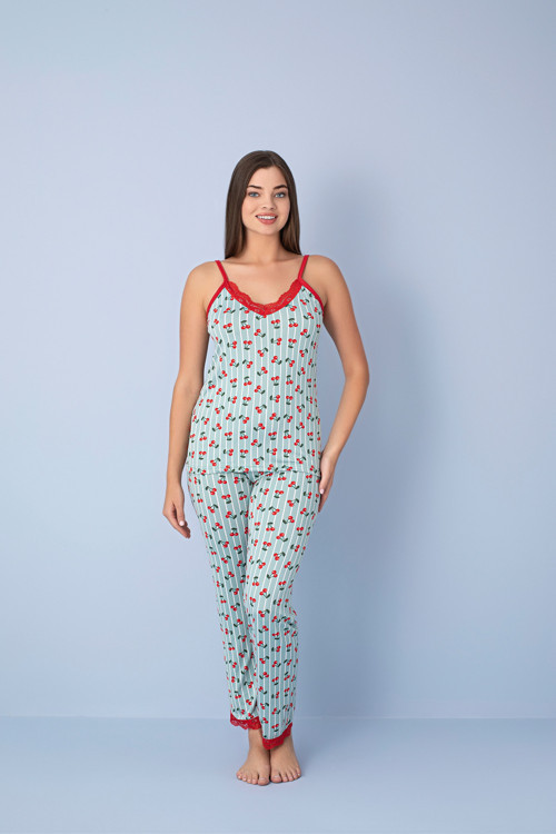 • Canlı ve şık tasarım: Çizgili zemin üzerine kiraz desenleri ile tasarlanan pijama takımı, enerjik ve zarif bir ev giyim stili sunar.