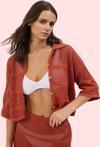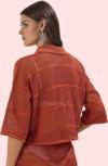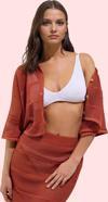 Yaz aylarının vazgeçilmezi olan bu şık kiremit kroşe plaj gömleği, rahatlığı ve tarzı bir araya getiriyor. Triko görünümlü polyester kumaştan üretilen gömlek, nefes alabilir yapısıyla sıcak havalarda serin kalmanıza yardımcı olur. Gömlek yaka tasarımı ve standart kollarıyla şık ve modern bir görünüm sunar. Düz desen, her türlü plaj kıyafetinizle uyum sağlar. Bel kısmındaki crop boyu, plaj şıklığını tamamlar. Bu gömlek, yazın enerjisini yansıtan bir parça. İster şort ister etekle kombinleyin, stilinize feminen bir dokunuş katın. Gün boyu rahatlık sunan kumaşıyla yazın tadını çıkarın.