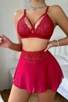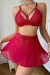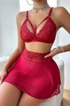 İç Giysim Kadın Kırmızı Göğsü ve Beli Dantel Detaylı Etekli Takım