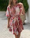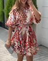 Kadın Kısa Balon Kollu Yuvarlak Yakalı Pileli Desenli Mini Elbise