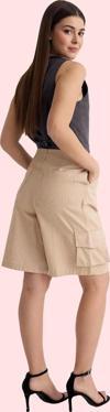 Bej rengi, her türlü üst giyimle uyum sağlamasıyla bilinen bir renktir. Bu şortu, basic bir tişört, şık bir bluz veya salaş bir gömlek ile kombinleyebilirsiniz. Ayrıca, spor ayakkabılarla veya şık sandaletlerle tamamlayarak farklı tarzlar yaratabilirsiniz. İşten sonra arkadaşlarınızla buluşmaya giderken veya hafta sonu gezintisine çıkarken giymek için ideal olan bu şort, günlük stilinize şıklık ve rahatlık katacaktır.