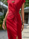 Kadın Kısa Kollu Bisiklet Yaka Yandan Yırtmaçlı Viskon Midi Elbise