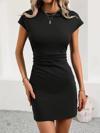 Kadın Kısa Kollu Bisiklet Yaka Yanlardan Büzgülü Kısa Janjan Krep Elbise