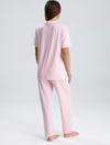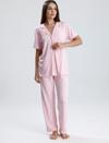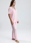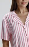 Pastel tonların en zarif haliyle tasarlanan bu pembe-beyaz çizgili kadın pijama takımı, rahatlığı ve şıklığı bir araya getiriyor. Hafif kumaşıyla cildinizi serin tutarken, önden düğmeli gömlek yakalı üst ve düz kesim alt parçası ile günün her saatinde konfor sunar. Tatlı çizgi deseni ve modern kesimiyle ev stilinize zarif bir dokunuş katın.