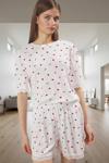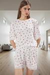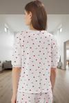 Ekru renkli, kalp desenli bu rahat pijama takımıyla kendinizi evinizin konforuna bırakın. Yumuşak örme kumaşından üretilen bu takım, gün boyu süren rahatlığı garanti eder. Dantel detaylı kısa kollu üst ve boru paça şorttan oluşan takım, yaz aylarında ideal bir seçimdir. Nefes alabilen yapısı ve şık tasarımıyla, hem evde hem de dinlenme anlarında tarzınızdan ödün vermeden rahat edeceksiniz. 60% Polyester, 35% Pamuk ve 5% Elastan karışımı kumaş, dayanıklılığın ve yumuşaklığın birleşimini sunar. Regular kalıbıyla vücut hatlarınıza mükemmel uyum sağlar. Makinede 60 derecede yıkanabilir olması da kolay temizlik sağlar. Şortun ve tişörtün alt kısımlarındaki dantel detayları, takıma zarif bir dokunuş katmaktadır. Bu pijama takımı, evde huzurlu ve şık vakit geçirmek isteyen kadınlar için mükemmel bir tercih. Rahat bir gece uykusu için veya evde dinlenirken kullanabilirsiniz.