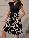 Kadın Kısa Kollu V Yakalı üst Janjan Krep Alt Desenli Süprem Mini Elbise