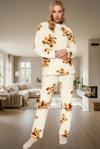 Wellsoft kumaşın eşsiz yumuşaklığı ve nefes alabilir yapısıyla, kendinizi pamuklara sarılmış gibi hissedeceksiniz. Ayıcık desenleri, takıma eğlenceli bir dokunuş katarken, ekru rengi ise her zaman şık ve modern görünmenizi sağlar. Regular kalıp ve uzun kolları, vücudunuza tam oturur ve rahat hareket etmenizi sağlar. Boru paçalı pantolon ile evinizde, misafir odanızda veya dinlenmek istediğiniz her yerde rahatça vakit geçirebilirsiniz.