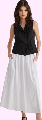 Dokuma kumaşı sayesinde nefes alabilir ve gün boyu rahatlık sağlar. Yüksek beli, vücut hatlarınızı kusursuz bir şekilde ortaya koyarken, kloş kesimi hareket özgürlüğünü en üst seviyede tutar. Düz deseni sayesinde diğer kıyafetlerinizle kolayca kombinleyebilirsiniz. Yaz aylarının sıcak günlerinde serin ve şık kalmanızı sağlar. Bu şık ve kullanışlı eteği, tişörtlerinizle, bluzlarınızla veya basic üstlerinizle kombinleyebilirsiniz.