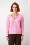 Ürün Özellikleri: Regular kalıp, %100 akrilik materyal, saç örgü desen, V yaka, düşük kol, triko kumaş, bordo renk, baskısız tasarım.