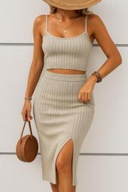 Kadın Kolsuz Askılı Crop Yırtmaçlı Midi Etek Fitilli Kaşkorse Takım