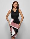 Kadın Kolsuz V Yakalı Geometrik Desenli Midi Dalgıç Elbise