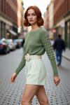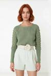 Ürün Özellikleri: Regular kalıp, akrilik materyal, dokulu desen, bisiklet yaka, reglan kol, triko kumaş, yeşil renk, cepsiz tasarım.
