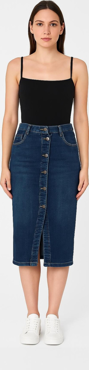 Önü Yan Düğmeli Midi Boy Likralı Lacivert Jean Etek
