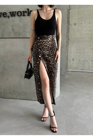 Kadın Önü Düğmeli Maxi Boy Kahverengi Siyah Leopar Desenli Likralı Denim Etek Kahverengi L