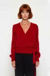 Ürün Özellikleri: Regular kalıp, %76 akrilik %24 polyester materyal, düz desen, kruvaze yaka, standart kol, triko kumaş, kırmızı renk, baskısız tasarım, kemersiz.