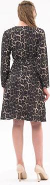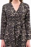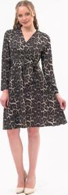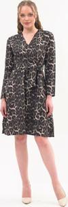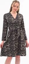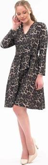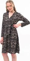 Leopar deseni ve kruvaze yakası ile dikkat çeken bu elbise, özel davetlerden günlük şıklığa kadar geniş bir kullanım alanı sunar. Topuklu ayakkabılarla zarif bir görünüm elde edebilir, deri ceket veya şal ile kombini tamamlayabilirsiniz.