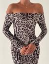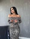 Kadın Madonna Yaka Dalgıç Kumaş Leopar Desen Maxi Boy Derin Yırtmaçlı Elbise
