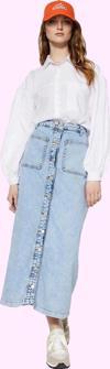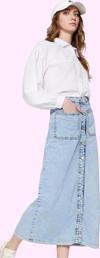 Yüksek kaliteli %100 pamuk denim kumaştan üretilen bu etek, nefes alabilir ve yumuşak yapısıyla konforlu bir kullanım sunar. Kalem kalıbı vücut hatlarınızı zarifçe sararken, yüksek bel detayları ile silüetinizi daha uzun ve ince gösterecektir. Düğmeli ön kapatma sistemi ise kullanım kolaylığı sağlar. Pratik cep detayları, küçük eşyalarınızı yanınızda taşıma imkanı sunar. Maxi boyu ile her boy ve vücut tipine uyum sağlayacak bu etek, günlük kullanım için idealdir.