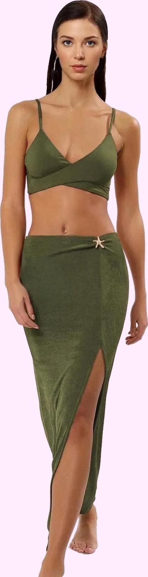 Desen: Düz; Kumaş Tipi: Örme; Renk: Haki; Ürün Detayı: Aksesuar Detaylı; Astar Durumu: Astarsız; Boy: Maxi; Siluet: Bodycone; Ortam: Beachwear; Dokuma Tipi: Sandy; Persona: Fashion Forward; Materyal Bileşeni: 95% Polyester, 5% Elastan; Yıkama Talimatı: T35; Sezon: Yaz; Menşei: TR