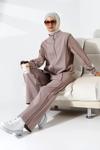 İki iplik, şardonsuz yumuşak kumaştan üretilen takım, fermuar kapamalı ve dik yakalı tasarımı ile modern bir duruş sunuyor.