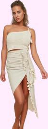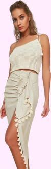 Bu şık ve rahat etek, yaz günlerinizin vazgeçilmez parçası olacak. Hafif ve nefes alabilir yapısıyla gün boyu konforlu bir kullanım sağlarken, şık tasarımı ve detaylarıyla da göz alıcı bir görünüm sunuyor. Midi boyu ile her vücut tipine uygun olan etek, hem plaj stilinizde hem de günlük kombinlerinizde rahatlıkla kullanabileceğiniz ideal bir parça. Keten görünümlü dokusuyla şıklığı yakalarken, kemer detayıyla belinizin ince görünmesini sağlıyor. Püsküller ise eteğe hareket ve şıklık katıyor.