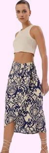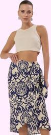 Bu çok yönlü etek, yaz günlerindeki sıcakta bile serin kalmanıza yardımcı olacak nefes alan %100 viskoz kumaştan üretilmiştir. Lilyum dokuma tekniği, etek kumaşına lüks bir görünüm ve his kazandırırken, dayanıklılığını da sağlar. Sarong stili, eteğe şık ve modern bir hava katarken, aynı zamanda giyip çıkarmayı kolaylaştırır. Midi boyu, her vücut tipine uygundur ve farklı stillerle kombinlenebilir.