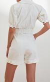 Ersefa Kadın Moda Balon Kol Boru Paça Gömlek Yaka Kısa Kemerli Gömlek Yaka Gabardin Mini Dokuma Tulum