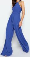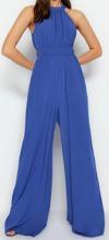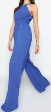 Ersefa Kadın Moda Reglan Kol Boru Paça Halter Yaka Uzun Beli Büzgü Detaylı Geniş Paça Maxi Dokuma Tulum
