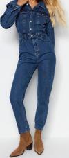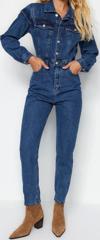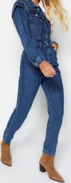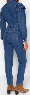 Kadın Moda Standart Kol Dar Paça Ceket Yaka Regular Dikiş Detaylı Denim Tulum
