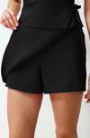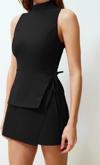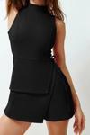 Kadın Moda Standart Kol Geniş Paça Dik Yaka Kısa Bağlama Detaylı Mini Dokuma Şort Etek Tulum