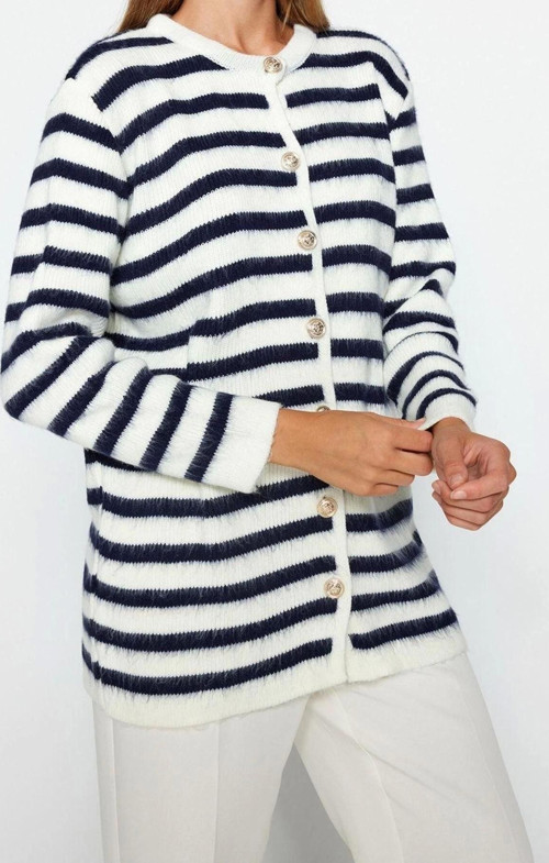 Kadın Modern Tarz Rahat Uzun Bisiklet Yaka Çizgili Kol Regular Triko Hırka - Ürünümüz hem günlük şıklık hem de rahatlık arayanlar için mükemmel bir seçenek.