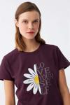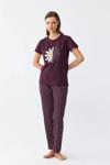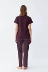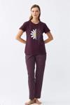 Mürdüm rengindeki pijama takımı, üzerindeki şirin papatya deseniyle hem göz alıcı hem de sevimli bir görünüm sunar. Kısa kollu üstü, V yaka kesimi ve şortuyla yaz aylarının vazgeçilmezi olmaya aday.