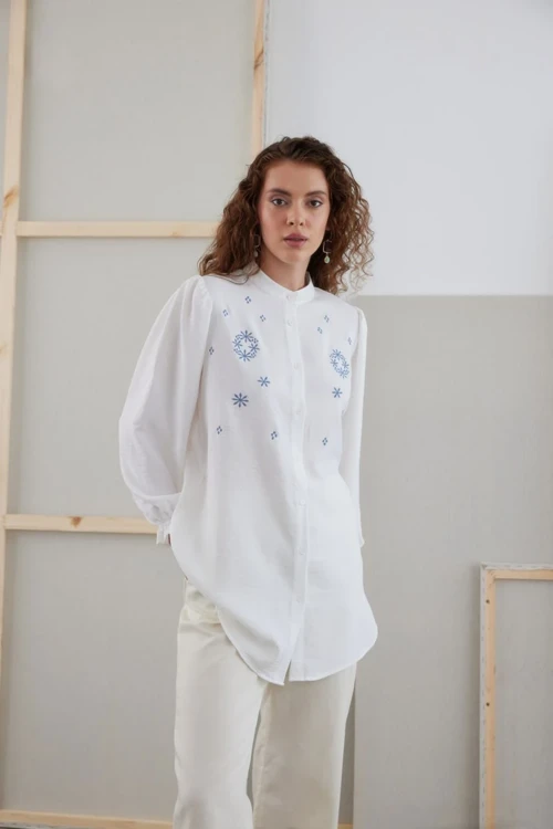 Hakim yaka formunda tasarlanmış uzun kollu gömlek modelidir. Ön bölümde yer alan nakış detayları ile sade ve modern bir görünüm sunmaktadır.