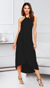 Kadın Omuzlardan Açık Boyundan Geçmeli Asimetrik Kesim Detaylı Viskon Elbise