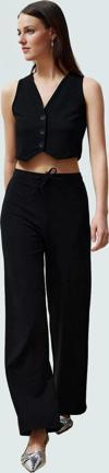 Şıklığı ve rahatlığı bir arada arayan modern kadınlar için tasarlanan bu siyah takım, gardırobunuzun yeni favorisi olacak. Düğmeli V yaka yeleğin zarif tasarımı, geniş paça pantolonun rahatlığıyla mükemmel bir uyum yakalıyor. Yüksek kaliteli örme kumaş, gün boyu konfor sunarken, pike dokuma tipi nefes alabilirlik sağlar. Fitted kalıp, vücut hatlarınızı zarifçe sararken, geniş paça detayı modern bir görünüm katıyor. İş görüşmelerinde veya günlük kombinlerinizde şıklıktan ödün vermeden rahatlığın tadını çıkarın. Bu takım, her ortama uygun çok yönlülüğüyle dikkat çekiyor. Elastik ve dayanıklı yapısıyla uzun süreli kullanım için ideal olan bu takım, kolay bakımıyla da pratik bir seçim.