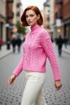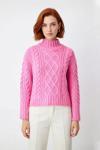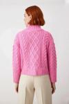 Ürün Özellikleri: Oversize kalıp, akrilik materyal, saç örgü desen, dik yaka, düşük kol, triko kumaş, pembe renk, uzun kol boyu.