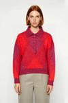 Ürün Özellikleri: Oversize kalıp, akrilik ve polyester materyal, baklava desen, polo yaka, düşük kol, triko kumaş, çok renkli.