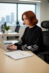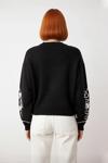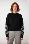 Ürün Özellikleri: Oversize kalıp, akrilik materyal, nakışlı / işlemeli desen, bisiklet yaka, düşük kol, triko kumaş, siyah renk.