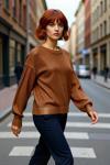 Bu göz alıcı kahverengi oversize triko kazak, kış gardırobunuzun en şık ve konforlu parçası olmaya aday. %100 akrilik materyali sayesinde soğuk kış günlerinde bile sıcacık tutarken, cilde dost, yumuşacık dokusuyla gün boyu eşsiz bir rahatlık sunar. Vücuda bol ve rahat oturan oversize kalıbı, modern ve salaş bir siluet çizerken, üzerinde yer alan varak baskılı deseniyle sade şıklığınıza ışıltılı ve sofistike bir dokunuş katar. Basic silueti ve kahverenginin sıcak, toprak tonu, her türlü kombininize zahmetsizce uyum sağlayarak çok yönlü bir kullanım imkanı sunar. Cepsiz tasarımı ise ürüne minimal ve zarif bir görünüm kazandırır.