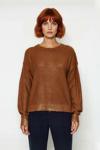 Ürün Özellikleri: Oversize kalıp, akrilik materyal, varak baskılı desen, bisiklet yaka, düşük kol, triko kumaş, kahverengi renk.