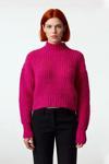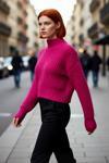 Ürün Özellikleri: Oversize kalıp, akrilik karışımlı materyal, düz desen, dik yaka, uzun düşük kol, triko kumaş, pembe renk, baskısız tasarım.