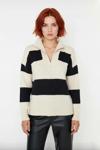 Ürün Özellikleri: Oversize kalıp, akrilik polyester elastan materyal, çizgili desen, dik yaka, düşük kol, triko kumaş, bej renk.