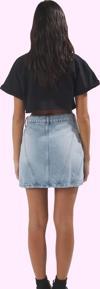 %100 pamuk denim kumaşın nefes alabilir özelliği, yaz sıcağında bile ferahlık sunarken, rigid dokuma tipi, uzun süreli kullanım ve şekil koruma garantisi sağlar. Yüksek bel tasarımı ve mini boyu sayesinde her vücut tipine uyum sağlar. Soluk efekt, vintage görünümünün modern bir yorumudur. Günlük kombinlerinizde tişört, gömlek veya bluzlarla kolayca kombinlenebilir. Eteğin bakımında T18 yıkama talimatlarına uymanız önerilir.
